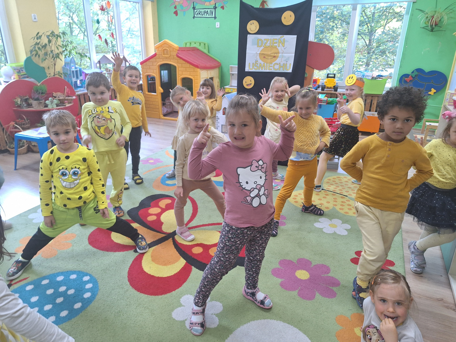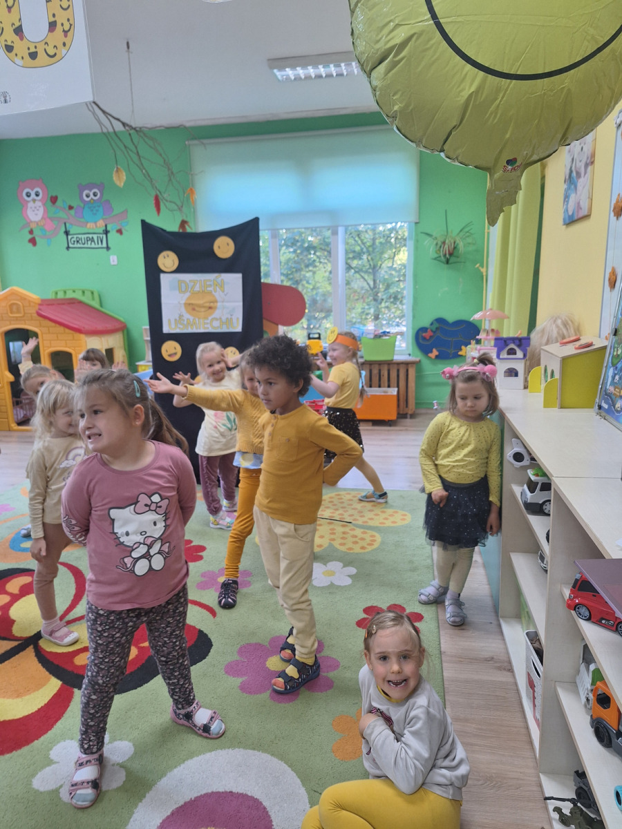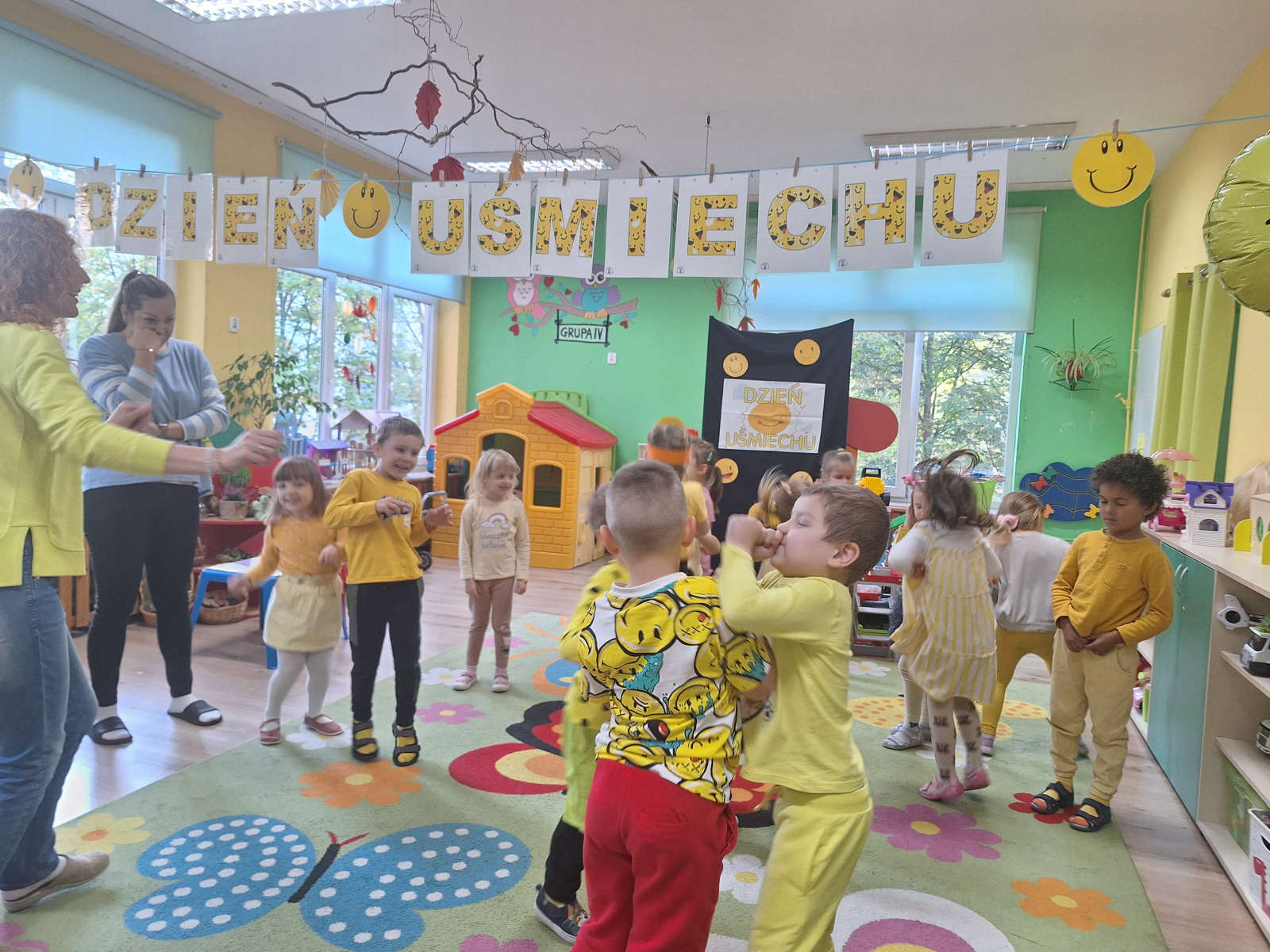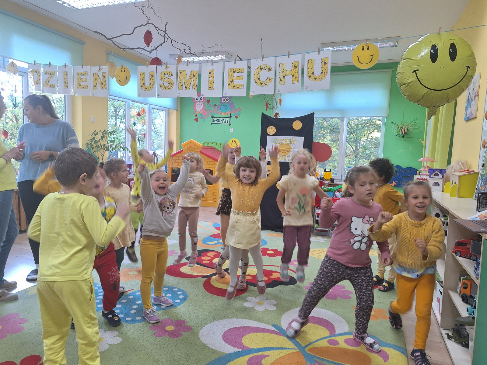 W pierwszy piątek października obchodzimy Światowy Dzień Uśmiechu. Jego celem jest promowanie optymizmu i dobrych emocji. Jak co roku, Talenciaki z radością włączają się w obchody tego wesołego święta. Ten dzień przedszkolaki rozpoczęły tańcem do piosenki Louisa Prima „When you’re smiling”. Później było równie wesoło. Szukaliśmy uśmiechów ukrytych w sali, robiliśmy śmieszne miny, przesyłaliśmy sobie uśmiechy na wzajem, obejrzeliśmy bajkę o krainie uśmiechu, a także wykonaliśmy uśmiechnięte odznaki, którymi obdarowaliśmy napotkanych podczas spaceru przechodniów z życzeniami „Wesołego Dnia Uśmiechu”. I jak można się było spodziewać, wszyscy się do nas uśmiechali i również życzyli nam miłego dnia.
