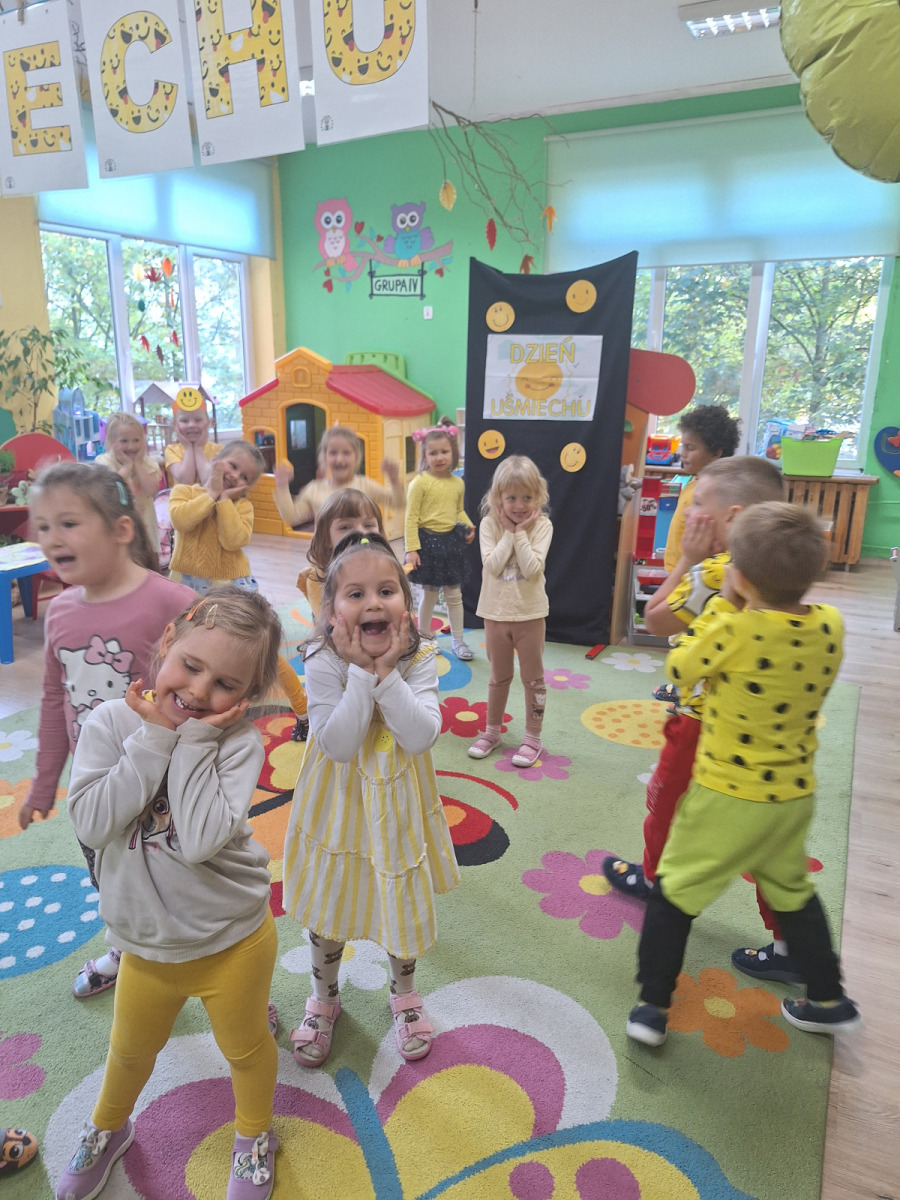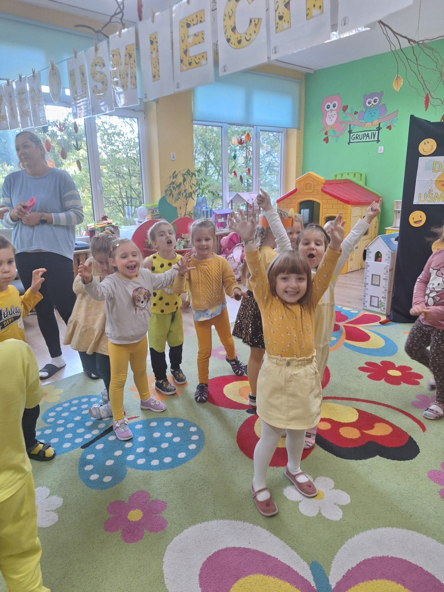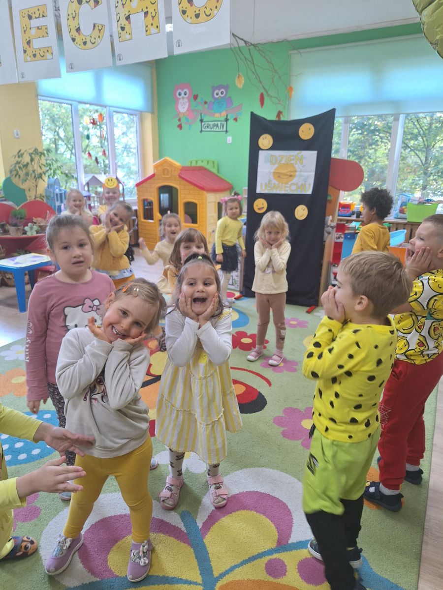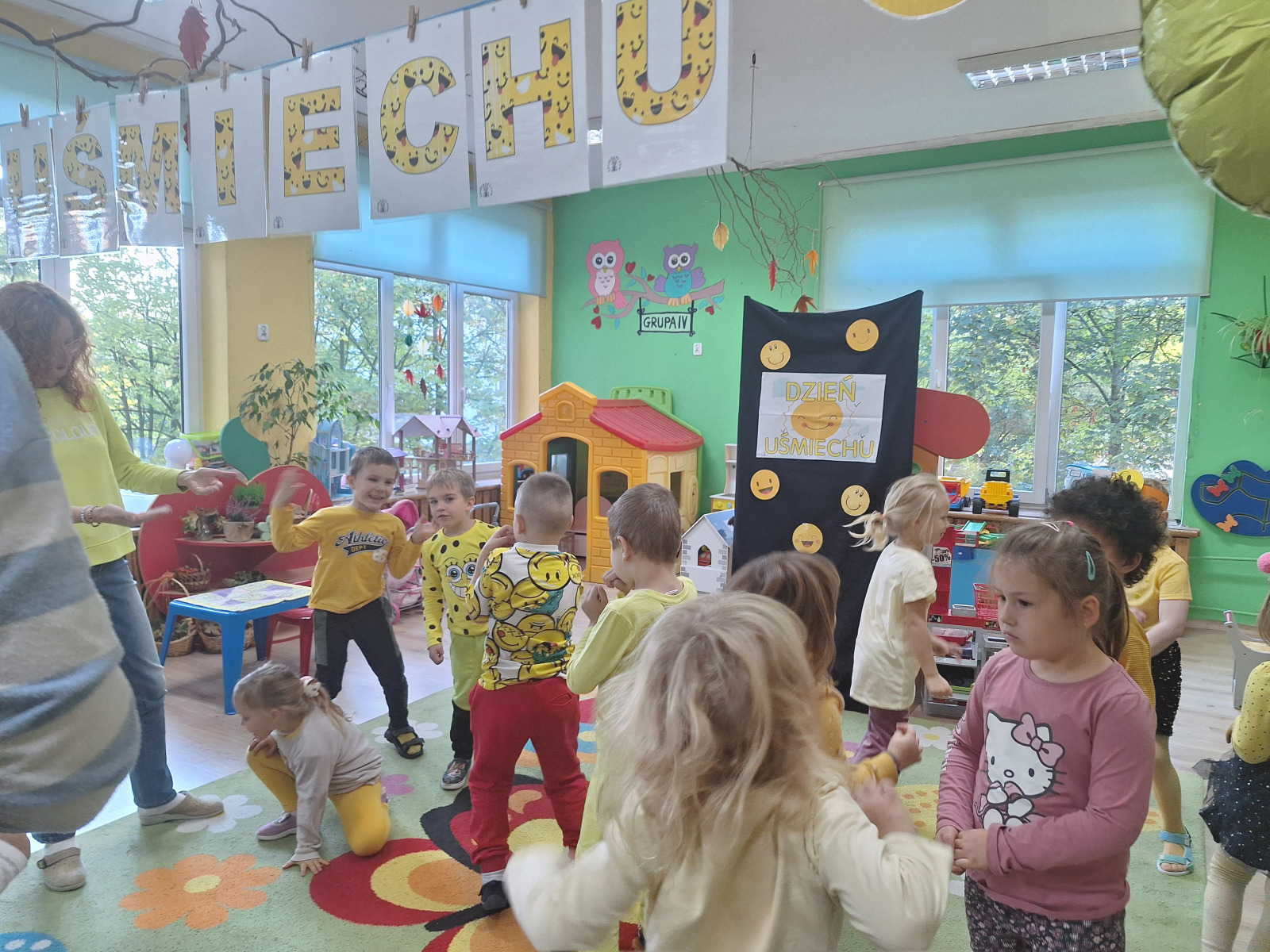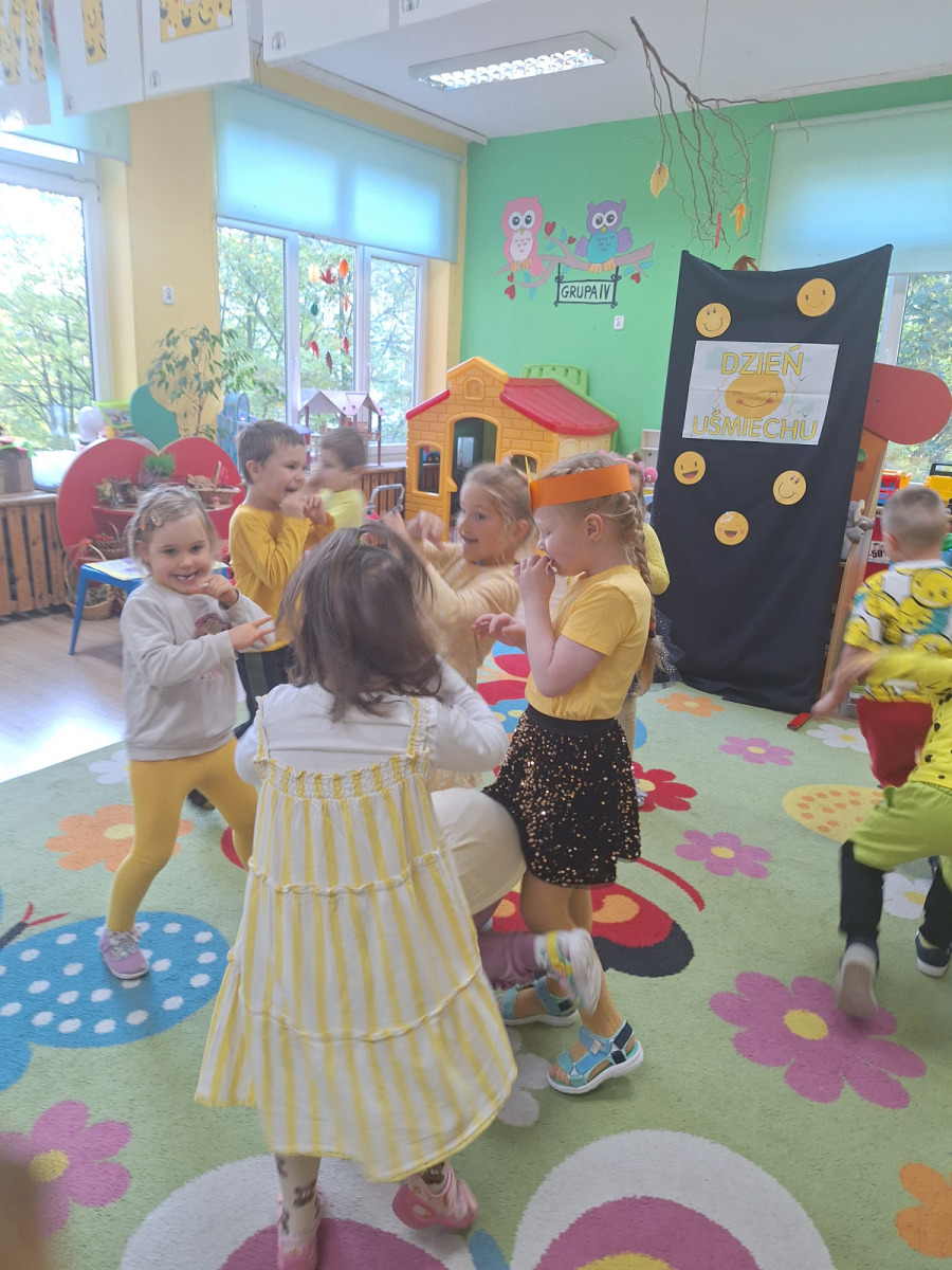 W pierwszy piątek października obchodzimy Światowy Dzień Uśmiechu. Jego celem jest promowanie optymizmu i dobrych emocji. Jak co roku, Talenciaki z radością włączają się w obchody tego wesołego święta. Ten dzień przedszkolaki rozpoczęły tańcem do piosenki Louisa Prima „When you’re smiling”. Później było równie wesoło. Szukaliśmy uśmiechów ukrytych w sali, robiliśmy śmieszne miny, przesyłaliśmy sobie uśmiechy na wzajem, obejrzeliśmy bajkę o krainie uśmiechu, a także wykonaliśmy uśmiechnięte odznaki, którymi obdarowaliśmy napotkanych podczas spaceru przechodniów z życzeniami „Wesołego Dnia Uśmiechu”. I jak można się było spodziewać, wszyscy się do nas uśmiechali i również życzyli nam miłego dnia.