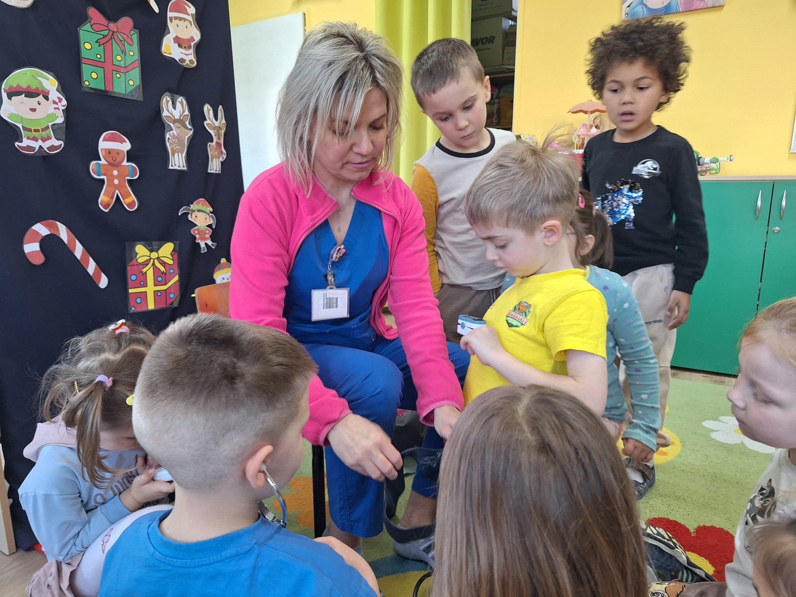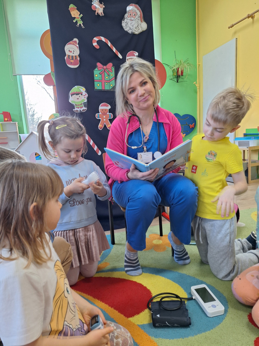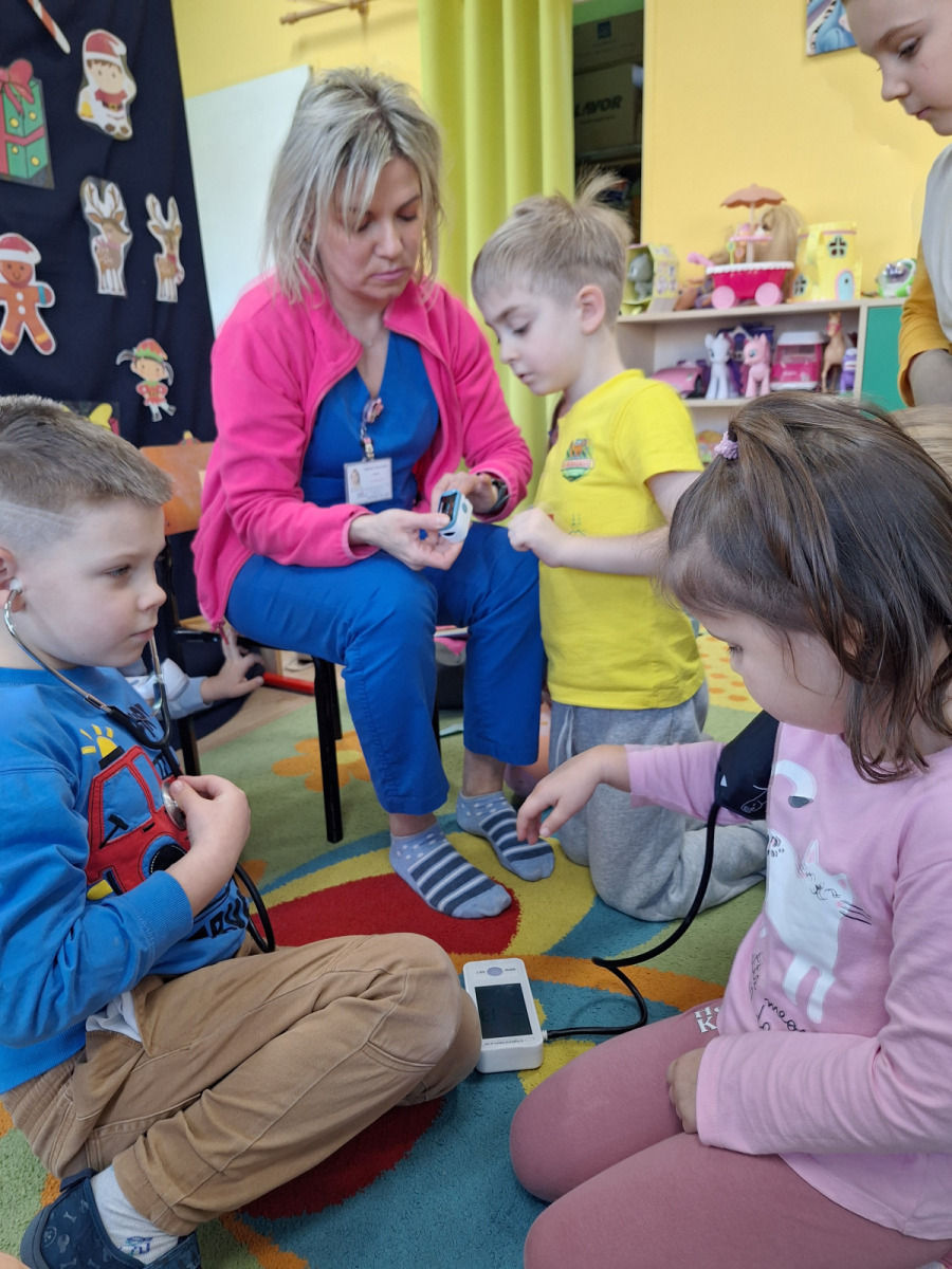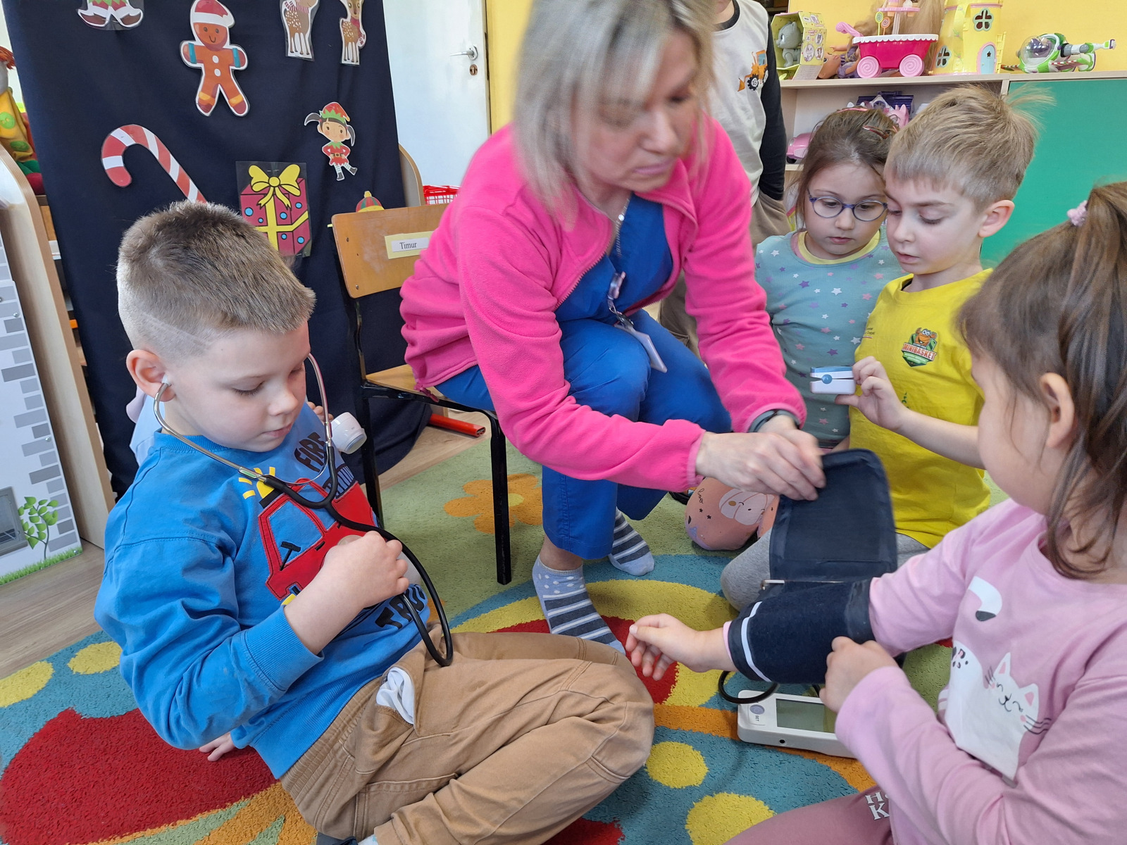 Kolejną Bohaterką w grupie Talenciaków była Pola. Ploeczka z pomocą Książki Bohatera opowiedziała nam o sobie, swojej rodzinie i przyjaciołach. Odwiedziła nas również mama naszej Bohaterki. Pani Marzena przeczytała dzieciom książeczkę i przybliżyła im zawód pielęgniarki. Przedszkolaki miały okazję zmierzyć ciśnienie, sprawdzić sobie temperaturę i posłuchać serca. To była wspaniała lekcja przez zabawę.