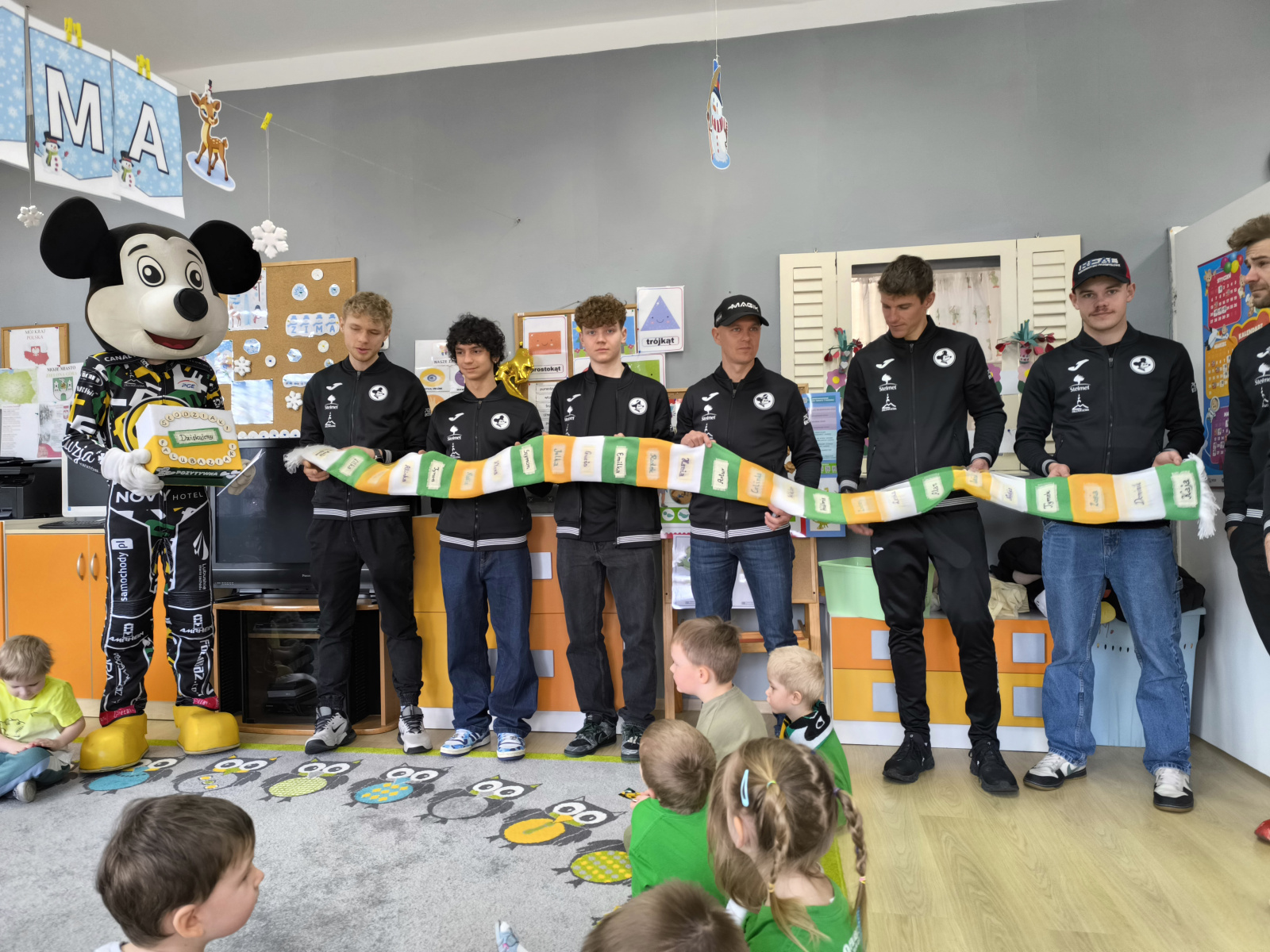 Goście wraz z Motomyszą chętnie przybijali piątki z przedszkolakami i pozowali do wspólnych zdjęć… To dopiero będzie fantastyczna pamiątka na lata… Dziękujemy za spotkanie , które było wyróżnieniem dla naszej POZYTYWKI za najciekawszy prezent podczas urodzin MOTOMYSZY… być może wśród nas rośnie już nowe sportowe, żużlowe pokolenie .