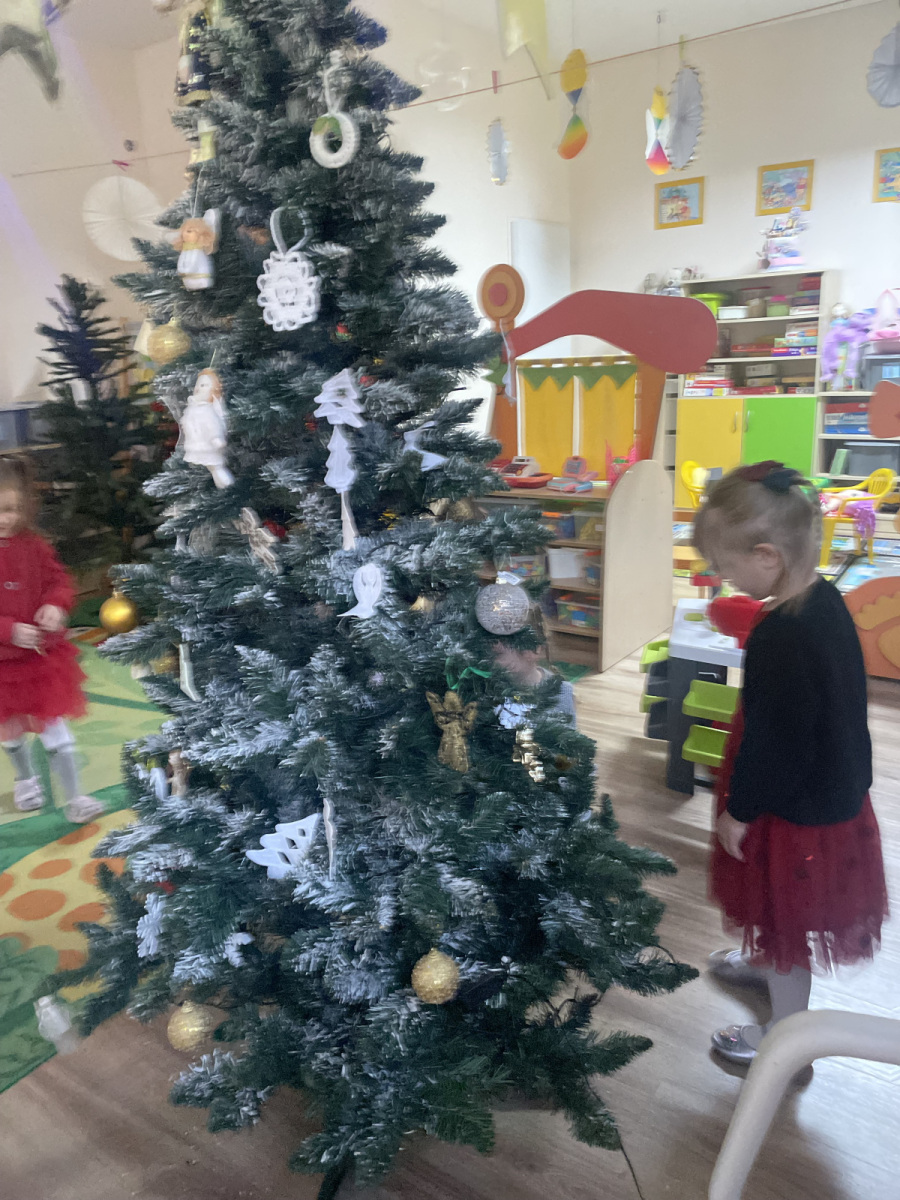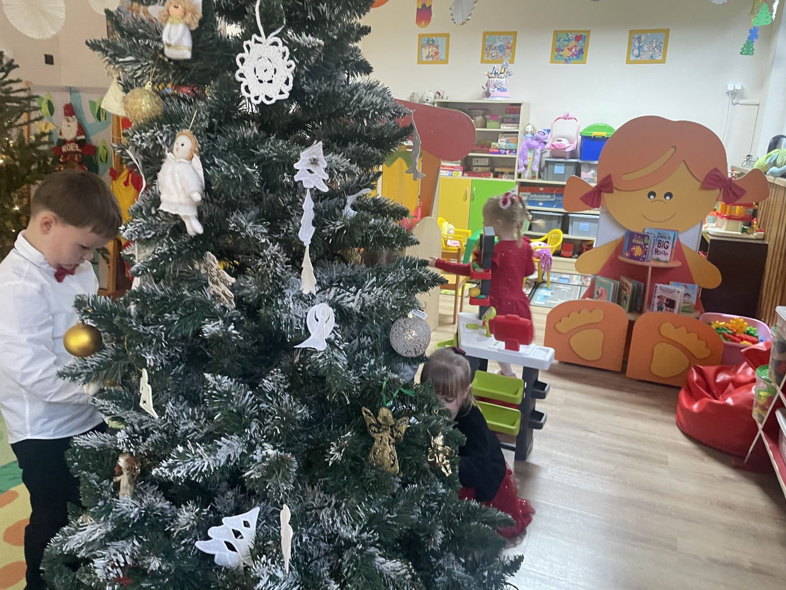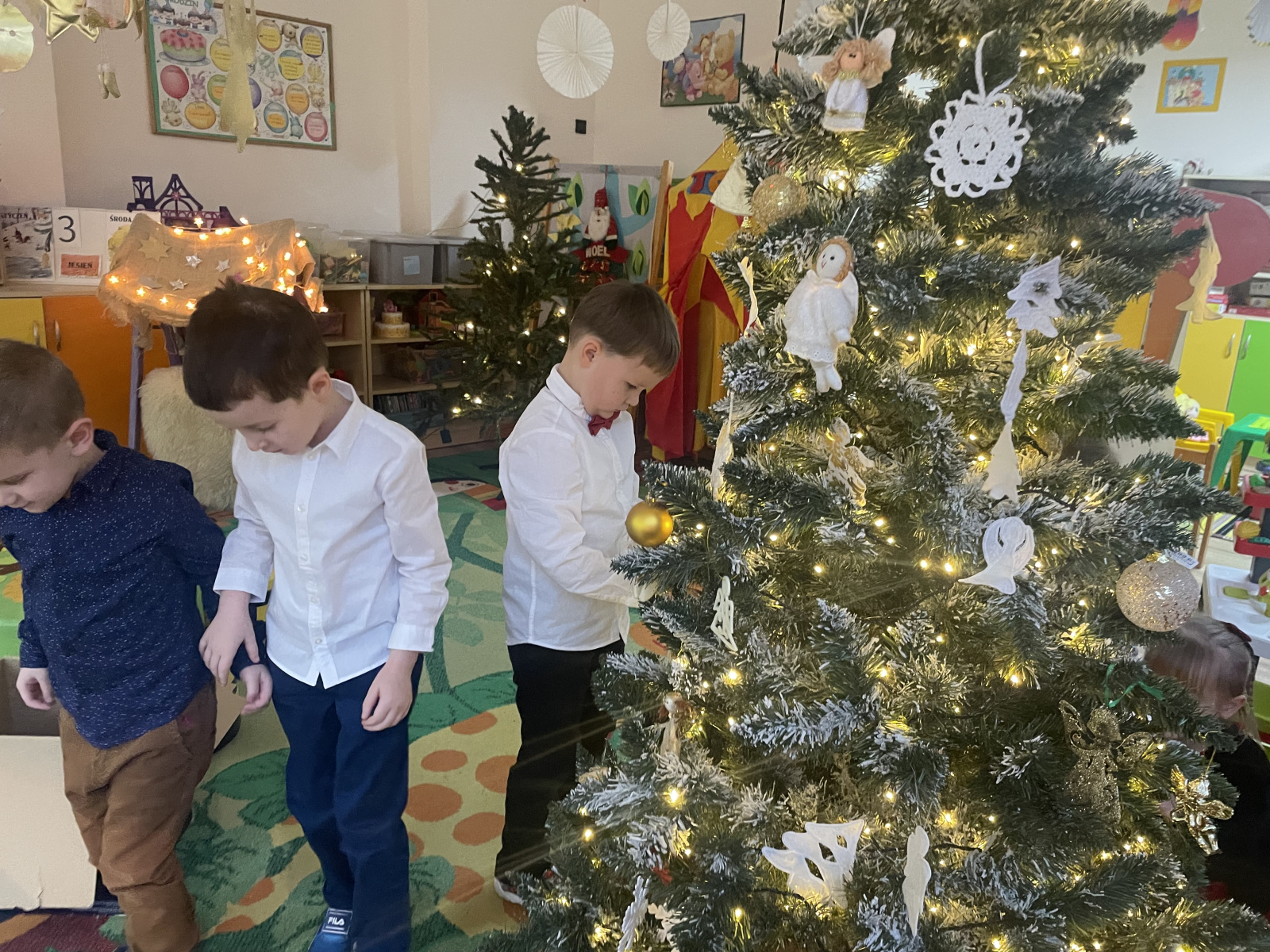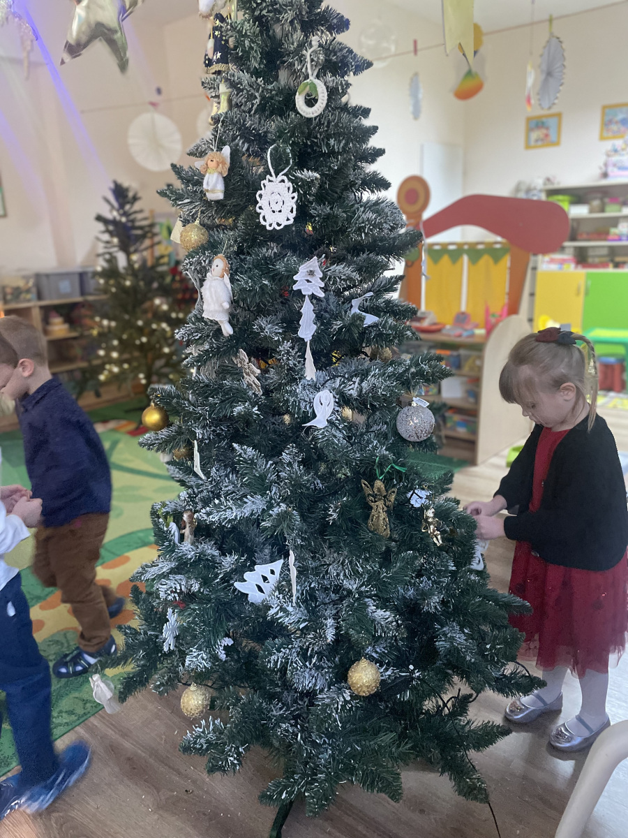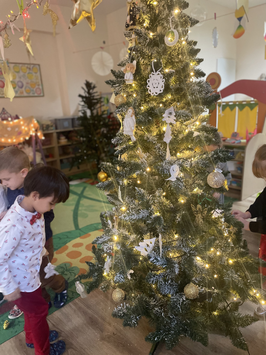 Choinka wygląda prześlicznie. Atmosfera w przedszkolu i wa naszej sali od razu zrobiła się świąteczna i bajkowa.
