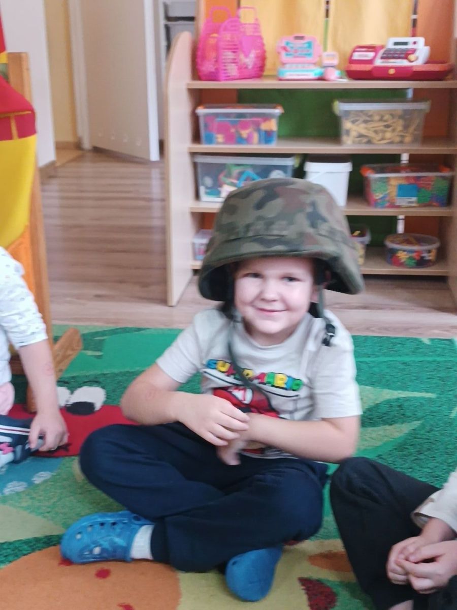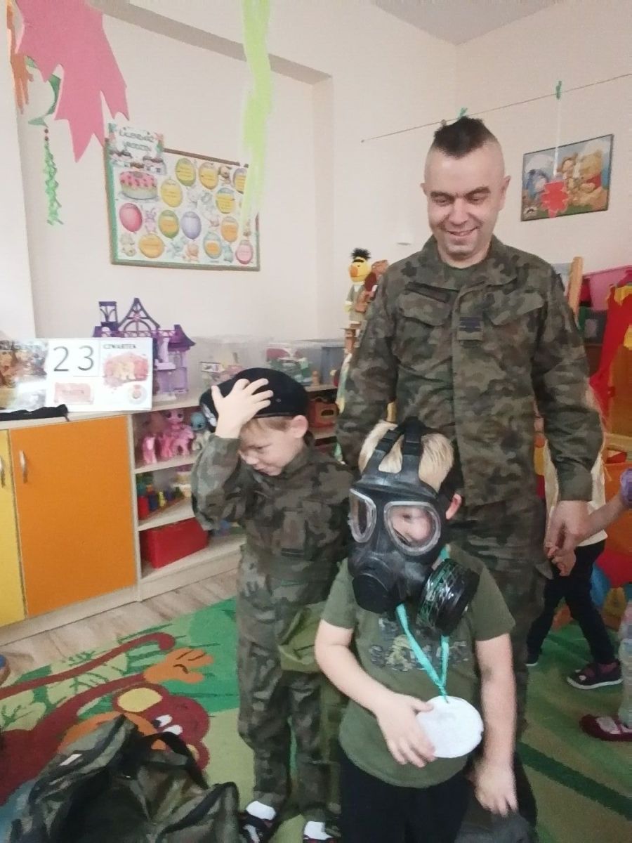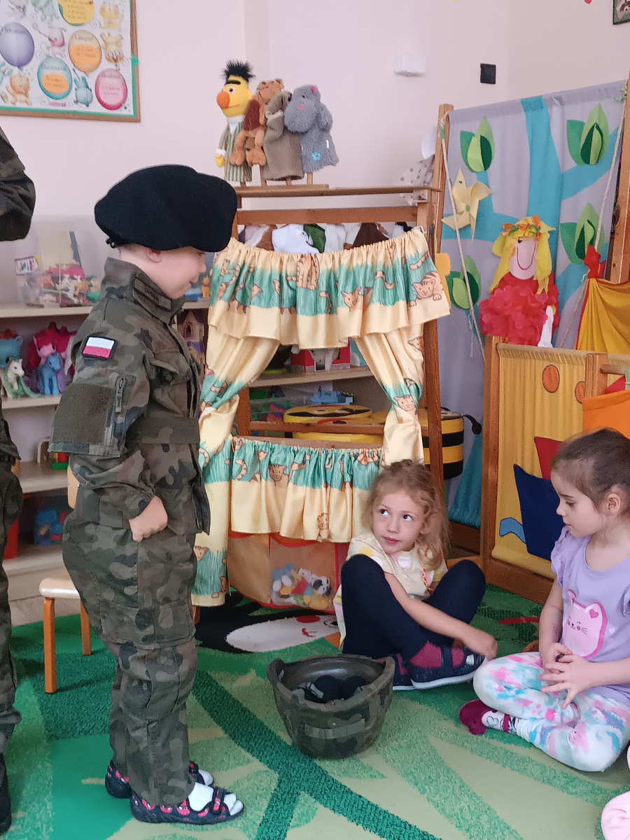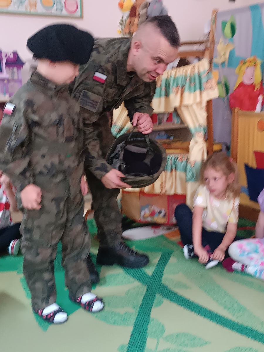 W minionym tygodniu bohaterem tygodnia był Tymon. Z tej okazji mieliśmy przyjemność gościć u nas tatę Tymona, który zapoznał dzieci z zawodem żołnierza. Dzieci z entuzjazmem oglądały elementy żołnierskiego stroju oraz wyposażenia. Nie zabrakło też nieodłącznego elementu – musztry.