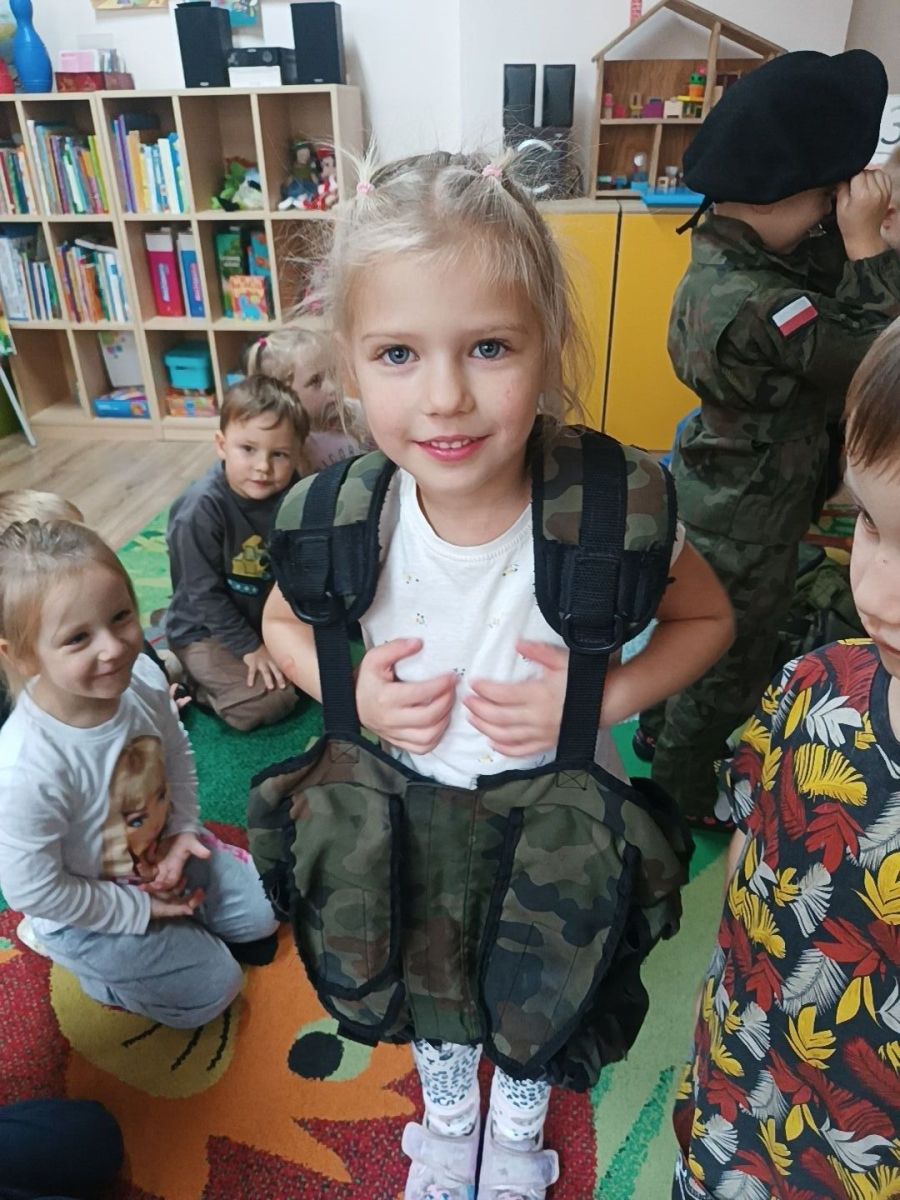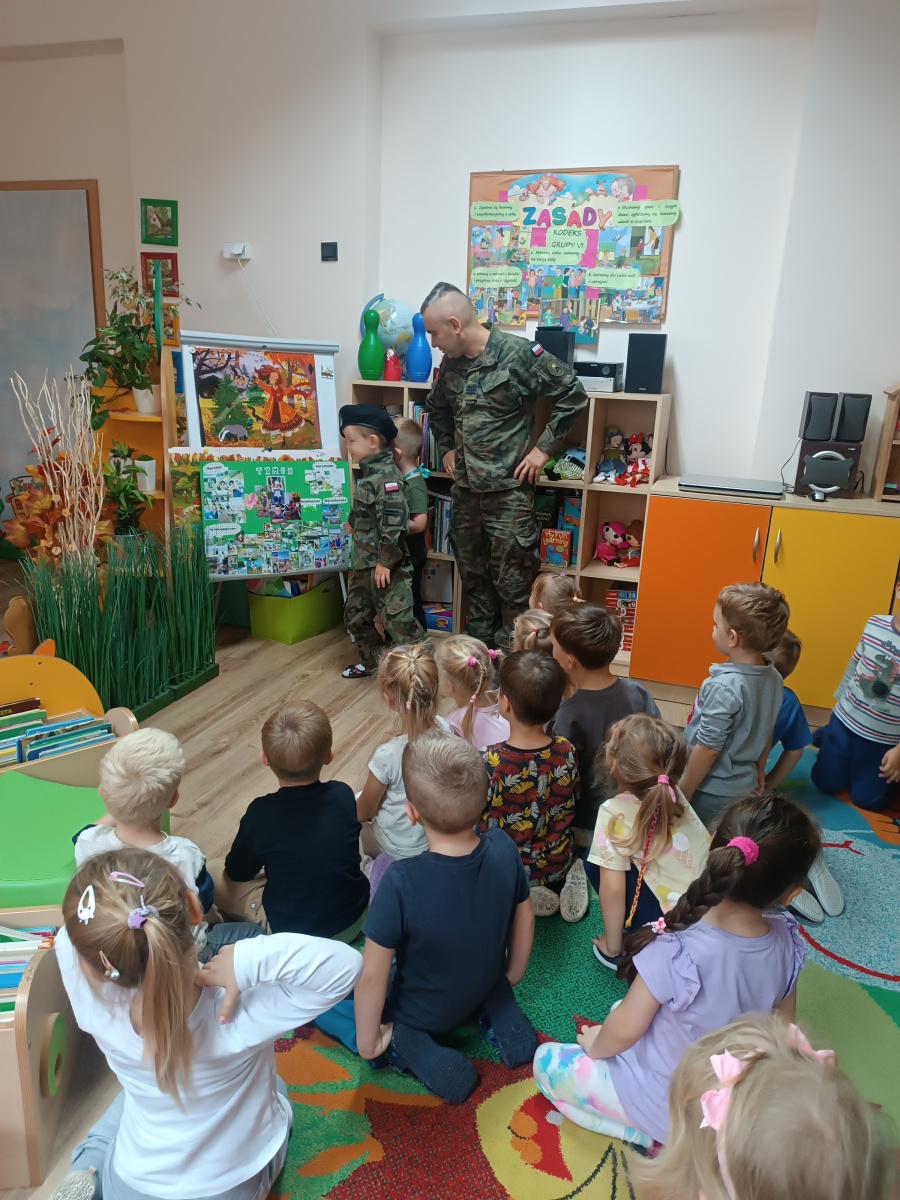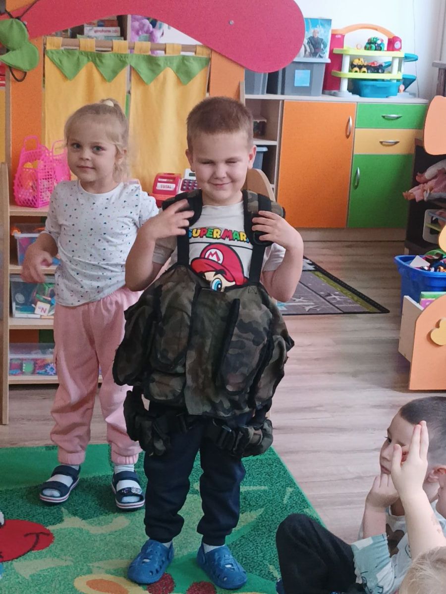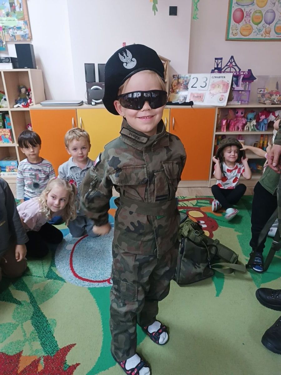 W minionym tygodniu bohaterem tygodnia był Tymon. Z tej okazji mieliśmy przyjemność gościć u nas tatę Tymona, który zapoznał dzieci z zawodem żołnierza. Dzieci z entuzjazmem oglądały elementy żołnierskiego stroju oraz wyposażenia. Nie zabrakło też nieodłącznego elementu – musztry.