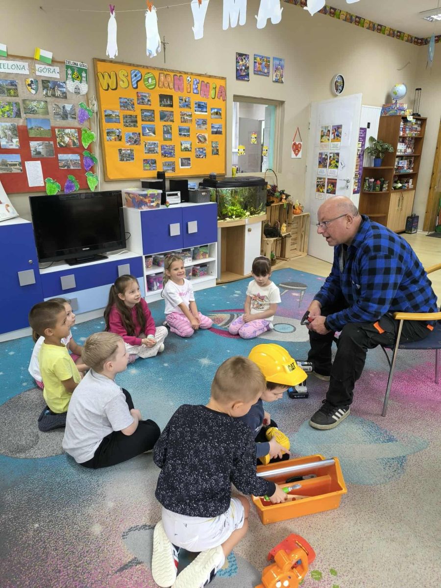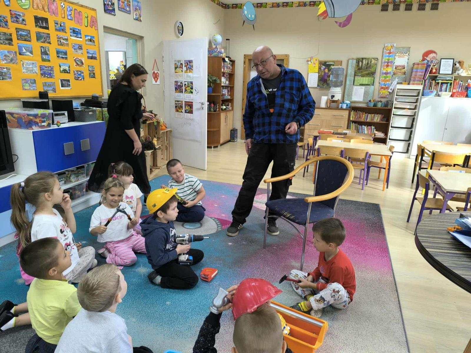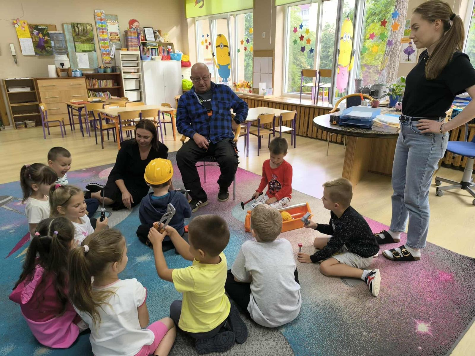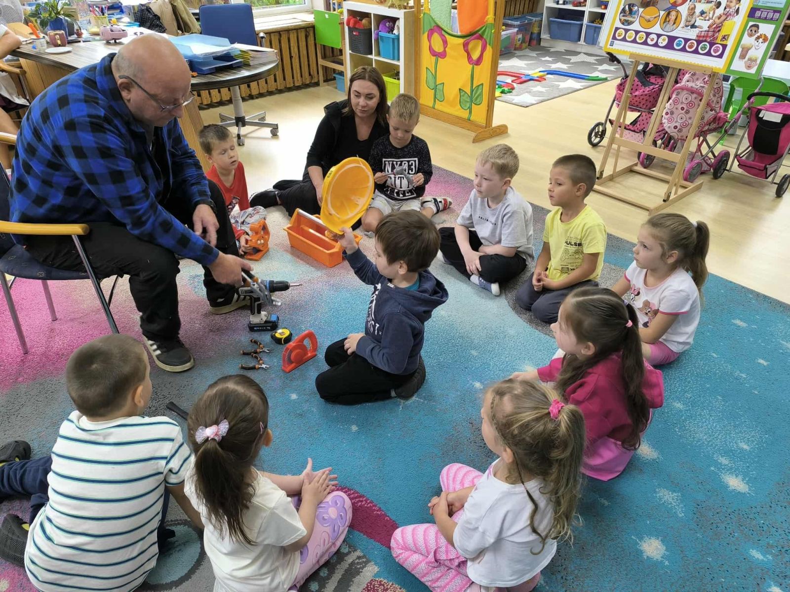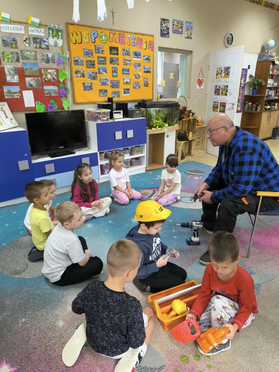 W związku z realizowanym tematem „Poznajemy otoczenie i pracowników”, w grupie „Czarodzieje” gościliśmy naszego przedszkolnego konserwatora Pana Marka. Pan Marek opowiedział na czym polega jego praca w przedszkolu oraz zaprezentował narzędzia, które wykorzystuje w pracy. Dzieci miały możliwość zadać Panu Markowi pytania oraz obejrzeć narzędzia z bliska. Było to bardzo miłe spotkanie.