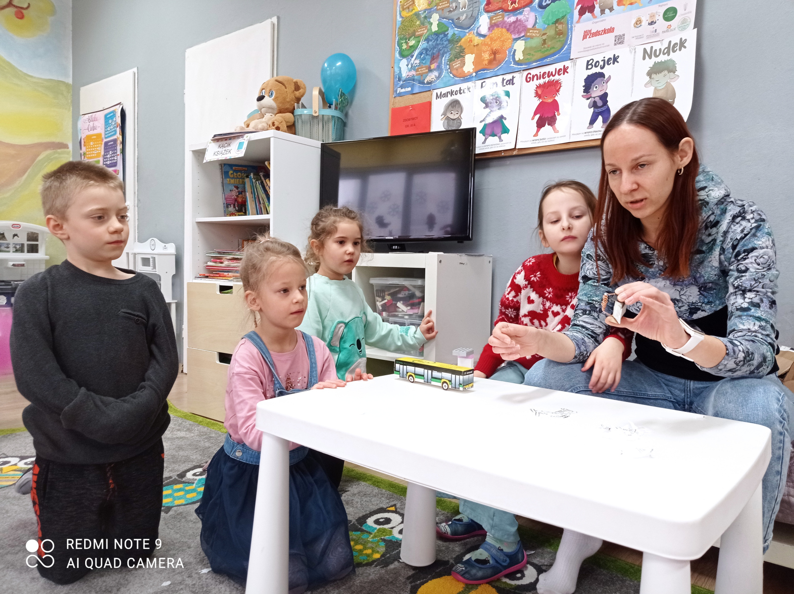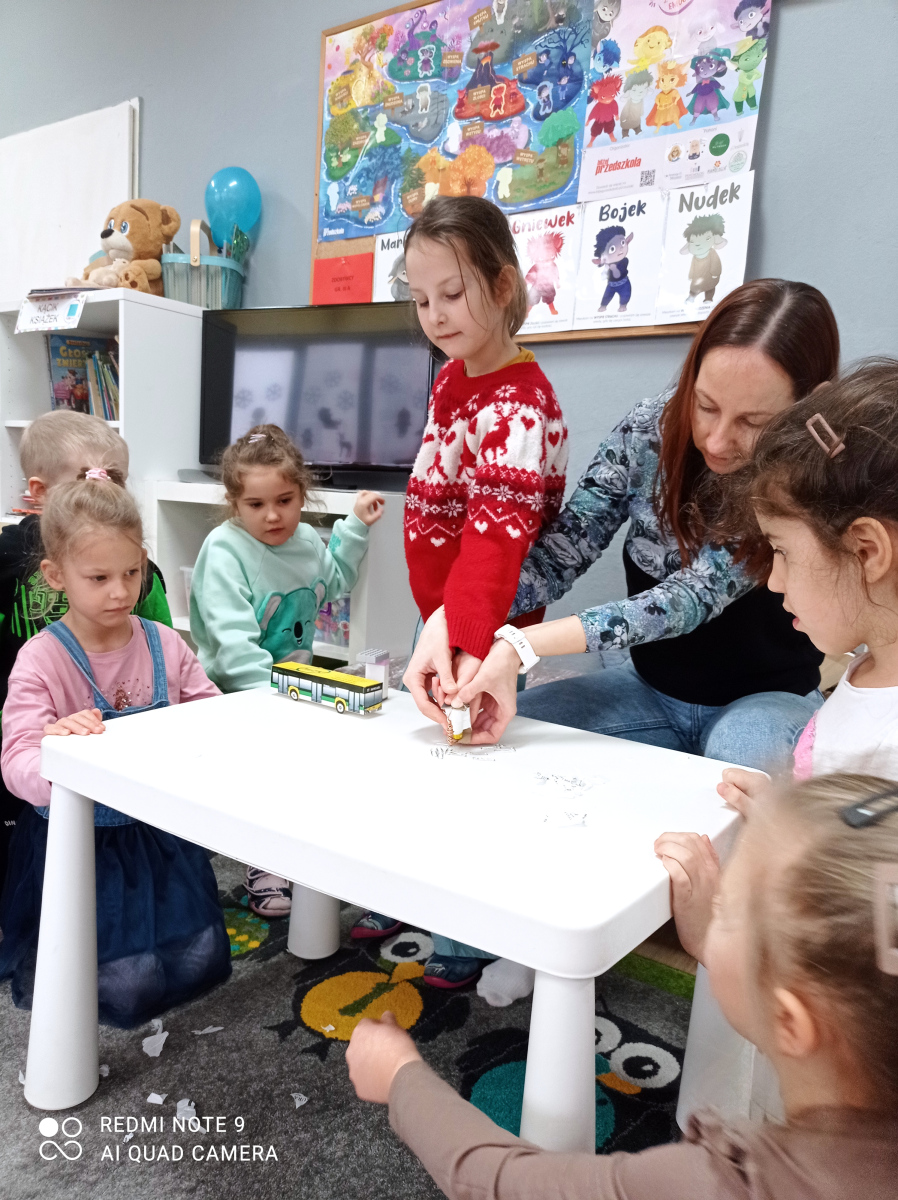 W ramach projektu Mama Alicji (p. Agnieszka) odwiedziła naszą grupę z propozycją zajęć dla dzieci. Dzieci dowiedziały się, gdzie pracuje i co robi pani Agnieszka, złożyły model autobusu MZK oraz wykonały wspólnie wiele eksperymentów. Dodatkowo dzieci bawiły się w zabawę kalambury oraz smakowały domowych wypieków Ali i p.Agnieszki.