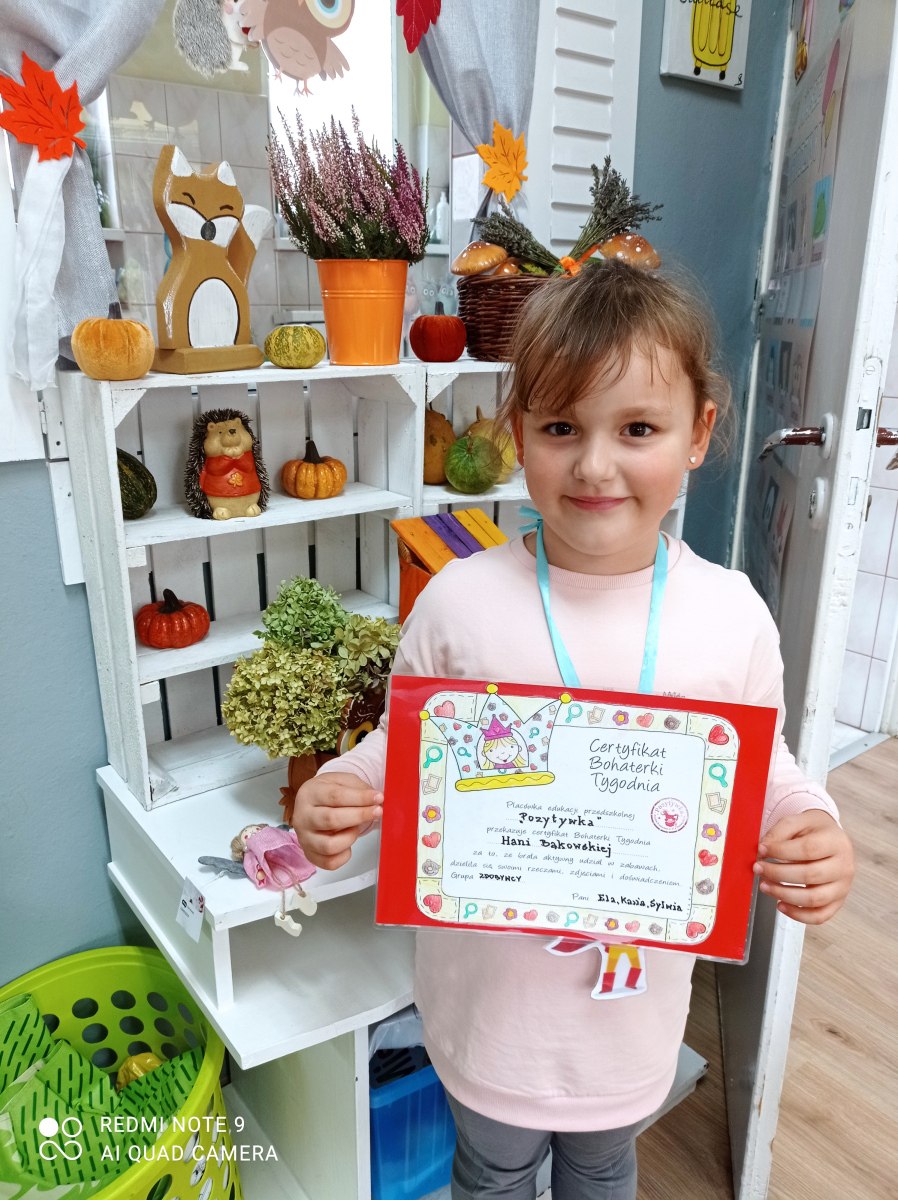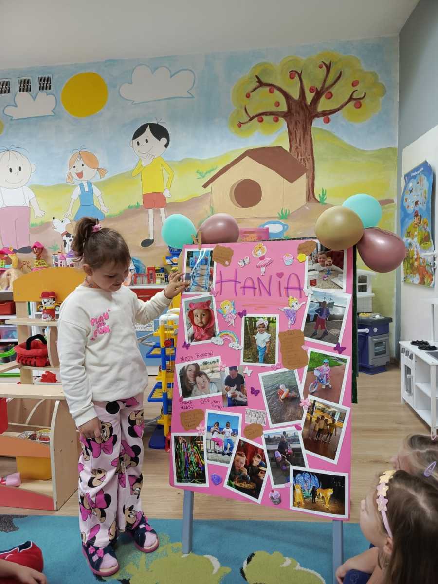 Od 06.10 do 10.10.2025 Hania B. była Bohaterką Tygodnia. Dziewczynka przyniosła plakat, który posłużył jej, aby opowiedzieć dzieciom o swojej rodzinie oraz o tym, co lubi robić w wolnym czasie. Hania B. cały tydzień przynosiła swoje zabawki, którymi dzieliła się z rówieśnikami. Hania B. przyniosła również materiały do wykonania slime, z czego dzieci bardzo ucieszyły się.