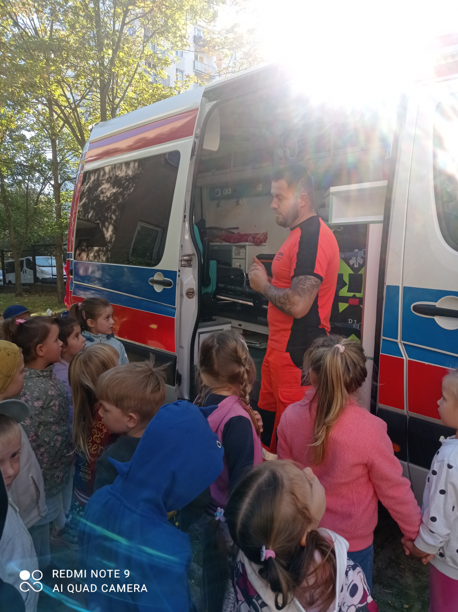 Jakiś czas temu, naszą grupę odwiedzili Panowie z Ratownictwa Medycznego. Pan Tomek i Pan Wojtek przygotowali dla naszych Zdobywców zajęcia, które były bardzo ciekawe i pełne wiedzy w zakresie ratowania życia ludzkiego. Dzieci dowiedziały się, w jaki sposób mogą pomóc osobie poszkodowanej oraz gdzie należy zadzwonić w sytuacji np. wypadku. Nie zabrakło również części praktycznej zajęć, gdzie chętne dzieci mogły nauczyć się oraz przećwiczyć na fantomie szkoleniowym, udzielanie pierwszej pomocy osobie poszkodowanej. Panowie pokazali także dzieciom jak wygląda wnętrze karetki pogotowia. Za te zajęcia edukacyjne, bardzo dziękujemy Pani Magdzie (Mamie Kingi), która zajęła się organizacją całego spotkania.