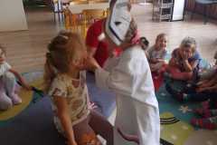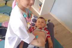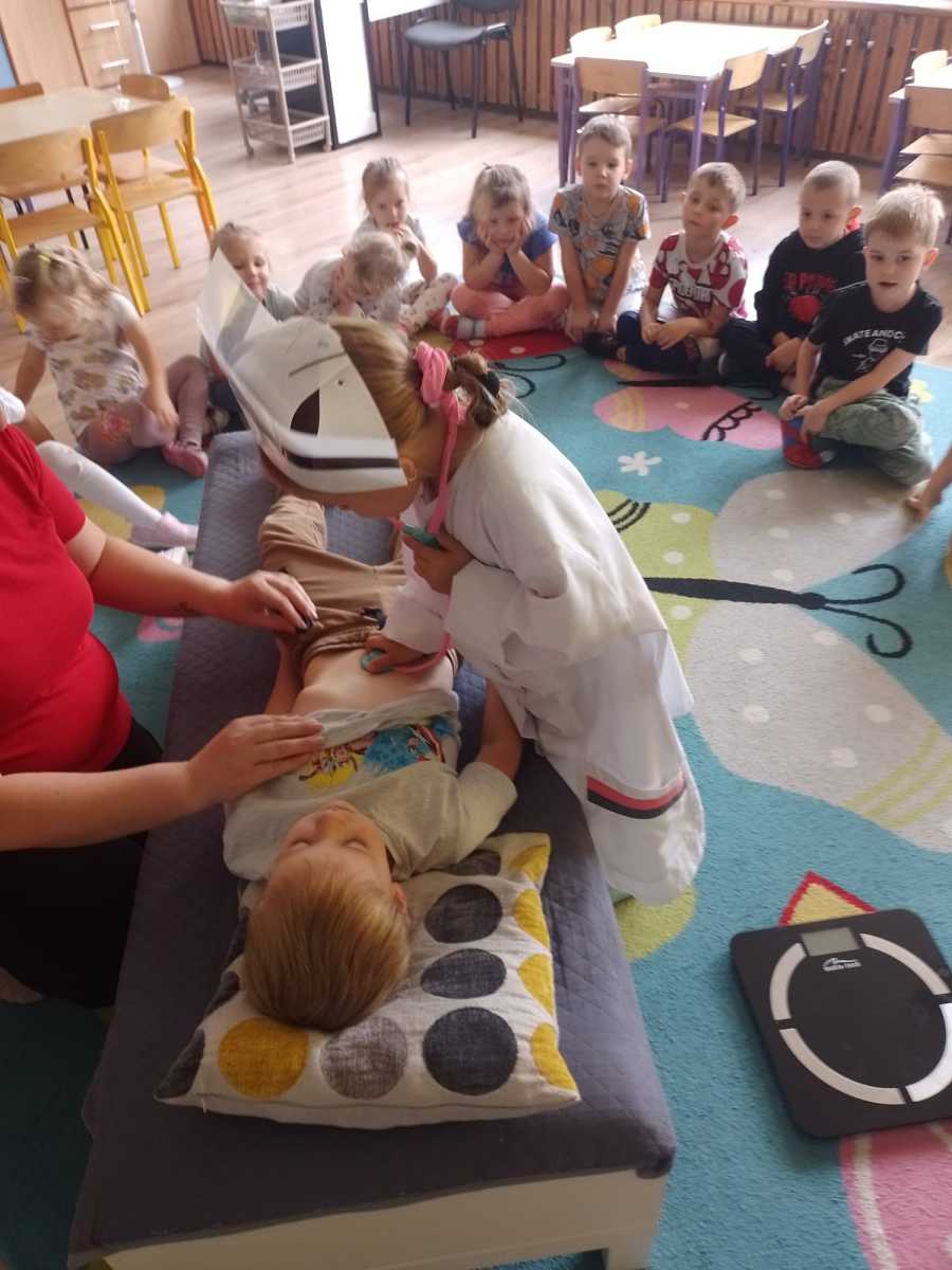 14 września przypada Światowy Dzień Pierwszej Pomocy. Z tej okazji Zdobywcy bawili się w scenki sytuacyjne „Wizyta u lekarza”. Lekarzem pierwszego kontaktu była Kinga, która przyszła tego dnia do przedszkola w białym fartuchu i z niezbędnymi przyrządami lekarskimi. Cała grupa wybrała się do lekarza, czyli do Pani Kingi i każdy Przedszkolak mógł opowiedzieć co mu dolega. Dzieci przychodziły z różnymi dolegliwościami np. ból kolana, ospa, ból ucha, ból brzucha itp. Pani Kinga badała, wypisywała recepty lub skierowania do konkretnych specjalistów 🙂 owe zajęcia były doskonałe do utrwalenia zwrotów grzecznościowych przez dzieci oraz poszerzenia wiedzy i słownictwa w zakresie udzielania pierwszej pomocy. Kindze i jej Mamie (Pani Magdzie) bardzo dziękujemy za pomoc w przygotowaniu zajęć edukacyjnych.